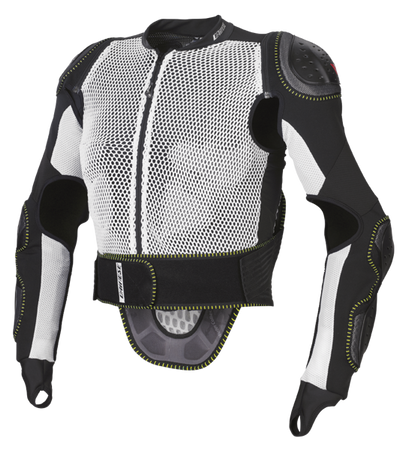 Tylna część protektora wykonana jest w technologi Wave Back Protector, która oprócz absorpcji energii udarowej, zabezpiecza też przed uszkodzeniem ciała poprzez specjalną zbroję z płytek połączonych syntetycznymi ścięgnami. Taka konstrukcja (płytki rozciągają się i zaginają na bokach aż o 25 stopni) zapewnia bardzo wysoki komfort użytkowania. Wyściółka z siatki dżersejowej, oddychająca. Konstrukcja perforowana dla dobrej wymiany ciepła i wentylacji. Protektor posiada płyty kompozytowe na ramionach, łokciach i przedramionach.